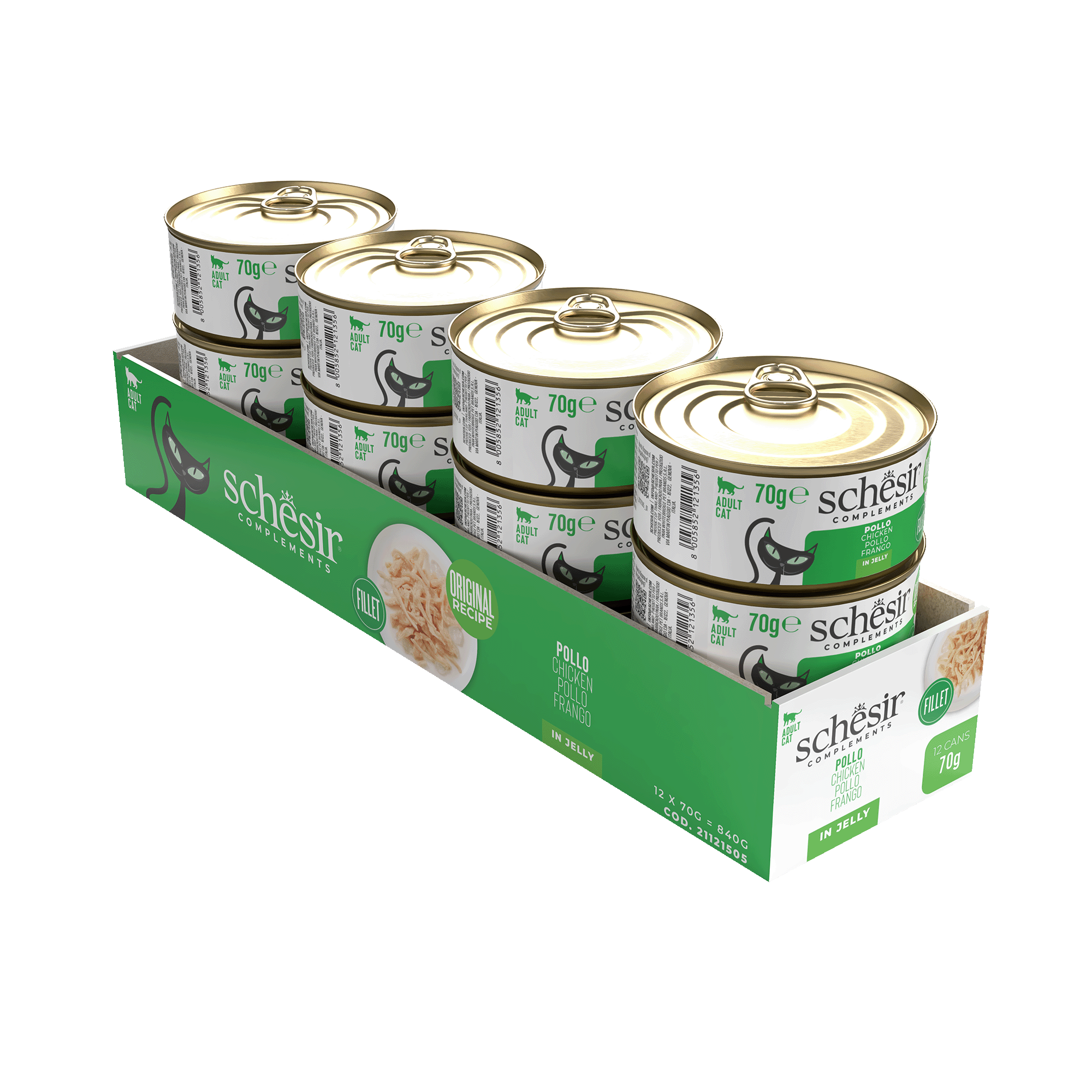 Suministrar hasta dos latas por día, acompañadas de piensos húmedos completos y/o croquetas Schesir. Servir a temperatura ambiente. Conservar en el frigorífico una vez abiertas y consumir en menos de 48 horas.