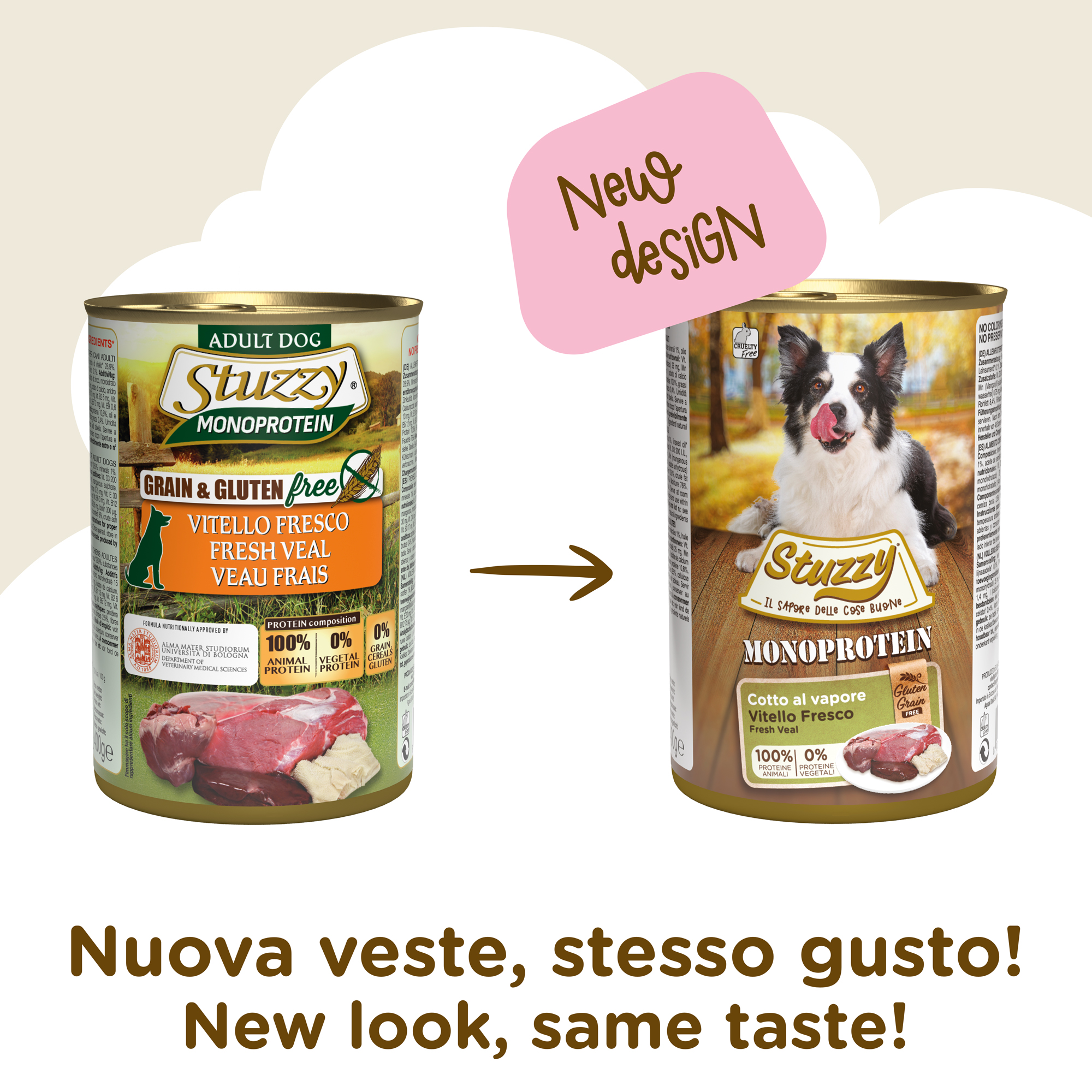 Composición: ternero fresco 70%, caldo de ternero 28,9%, sustancias minerales 1%, aceite de semillas de lino 0.1%.