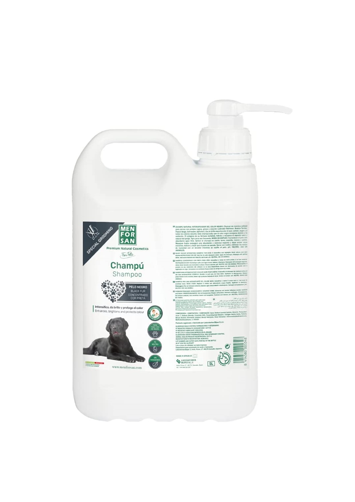 - Champú de máxima calidad para perros que intensifica los colores negros y las tonalidades grises y oscuras.