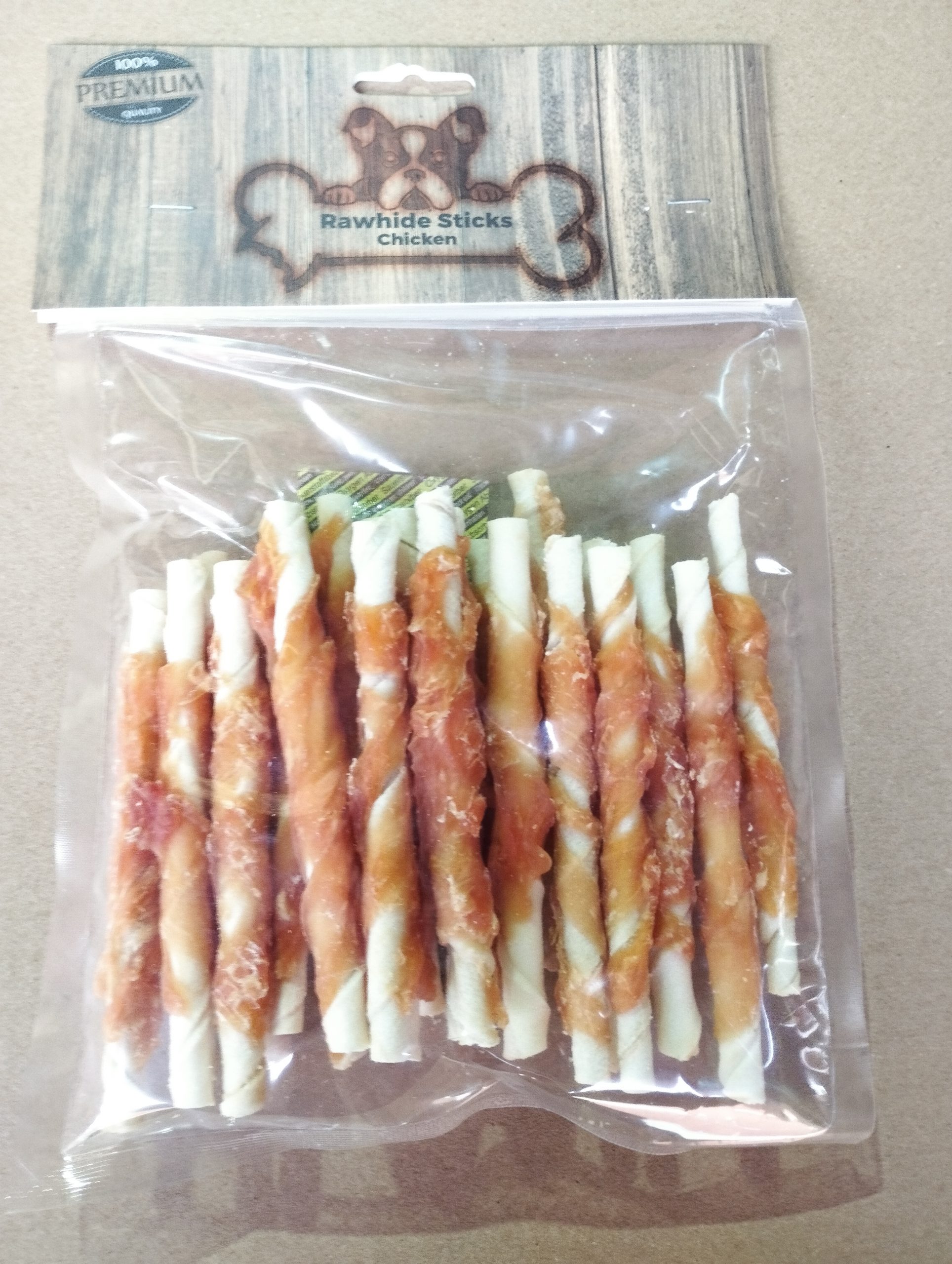 Composición : pollo 36% , piel de buey 60% , proteinas vegetales 2.5%, glicerina 1.25%