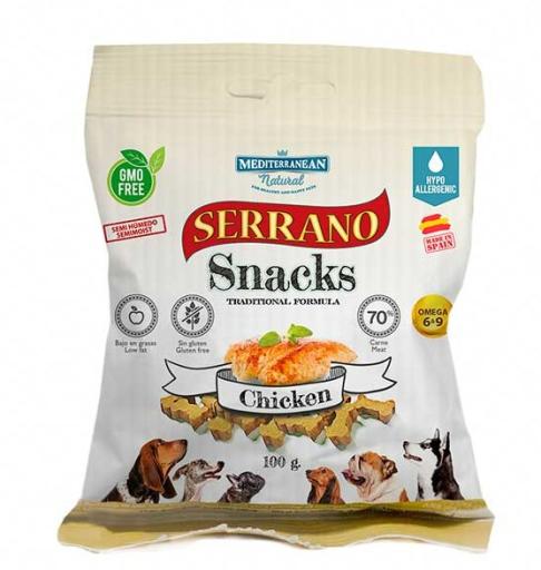 Los Serrano Snacks de MEDITERRANEAN NATURAL, delicadamente cortados en pequeñas cantidades con forma de huesito, garantizan la seguridad de la mascota, mantienen su pureza y todos los nutrientes, reflejan la dieta natural y contienen un 70 % de carne.