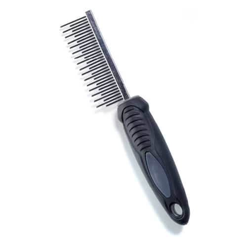 Práctico peine con mango de plástico para perros.