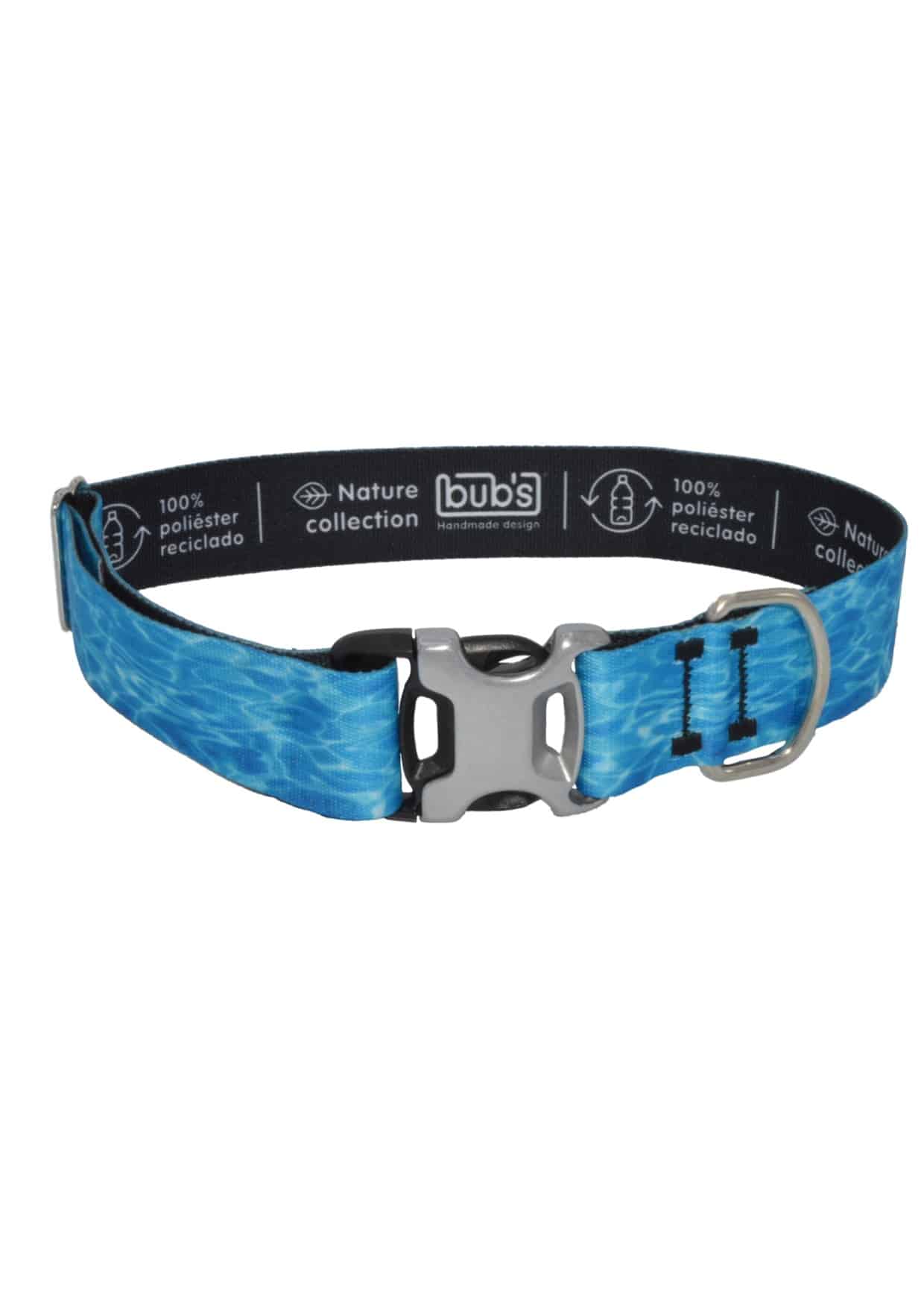 Los collares arneses y correas para perro BUB’S NATURE COLLECTION están fabricados con POLIESTRER 100% RECICLADO, estampados(AQUA /LAVA) inspirados en la naturaleza ya que al ser producto reciclado ayuda a la conservación del medio ambiente reduciendo las emisiones de CO2. Los herrajes son metálicos y el cierre es de ALUMINIO/POM de la conocida marca duraflex. Las medidas del cuello son : Talla S de 25 a 36 cm, talla M/L de 34 a 53 cm, talla XL de 42 a 70 cm.