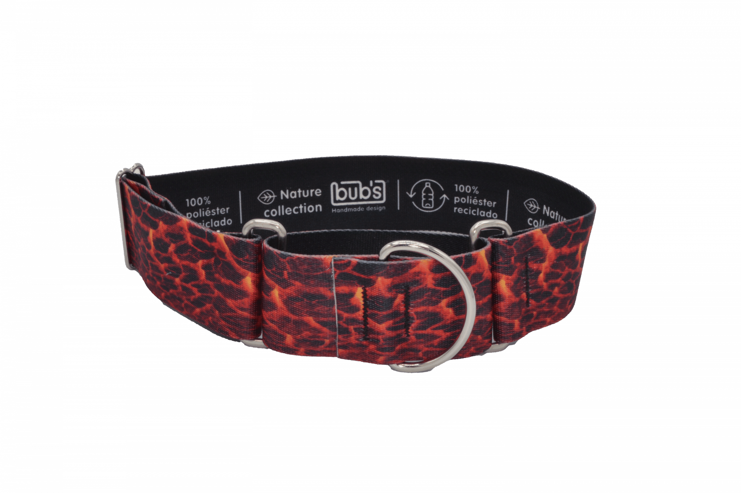 Los collares BUB’S NATURE COLLECTION Martingale están pensados para todo tipo de perros pero especialmente para galgos, Piccolo talla S, Whippet talla M, Greyhound talla L, otros tipos de perro talla XL.Las medidas del cuello SIN CONTAR LA PARTE MARTINGALE son: Talla S de 16 a 23 cm, talla M de 22 a 34 cm, talla L de 25 a 38 cm, talla XL de 35 a 57 cm. Los anchos de las cintas son de 40 mm las tallas S/M y de 50 mm las tallas L/XL. Los herrajes son metálicos y el poliester de la cinta es 100% RECICLADO, los estampados estan inspirados en la naturaleza (LAVA /AQUA) ya que al ser producto reciclado ayuda a la conservación del medio ambiente reduciendo las emisiones de CO2. Las medidas de la parte martingale es de + 10 cm para poder pasar el collar por la cabeza,pero no para tamaño del cuello.