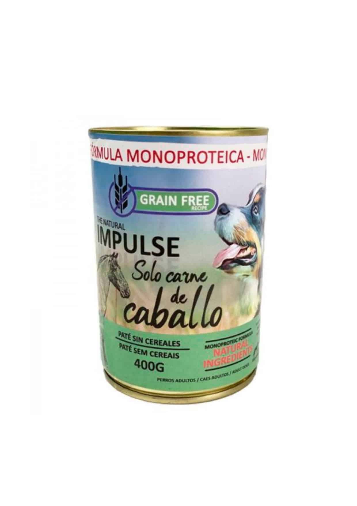 Las latas premium NATURAL IMPULSE CABALLO se trata de un alimento húmedo de paté de caballo con ingredientes 100% naturales, sin contenido en cereales y monoproteico (contiene un 97% de carne de CABALLO). Envase de 400 gr
