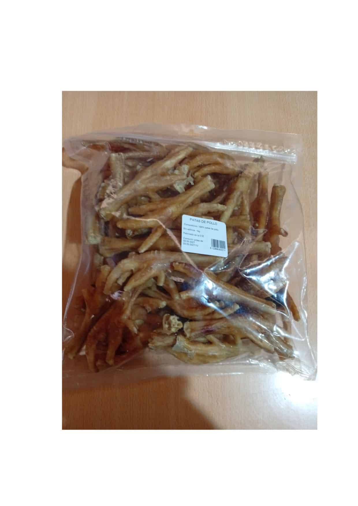 Snack natural de patas de pollo desecadas para perro.