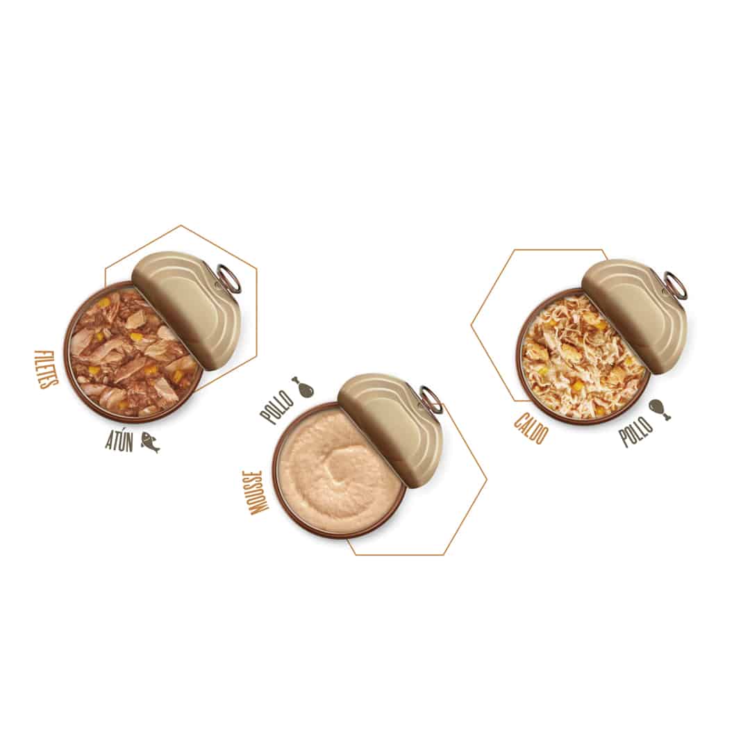 CONTIENES 3 LATAS CON LAS TRES DIFERENTES TEXTURAS DE LA DIETA SCHESIR PARA GATOS DESTINADA A LA PERDIDA DE PESO