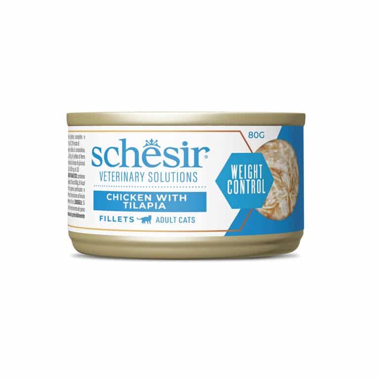 Schesir Veterinary Solutions Weight Control (Control de peso) Filetes de Pollo con Tilapia es un alimento dietético completo para gatos adultos que ayuda a reducir el exceso de peso. Con pollo y tilapia naturales, bajo en grasa, rico en proteínas y con condroitina y glucosamina para el bienestar articular.