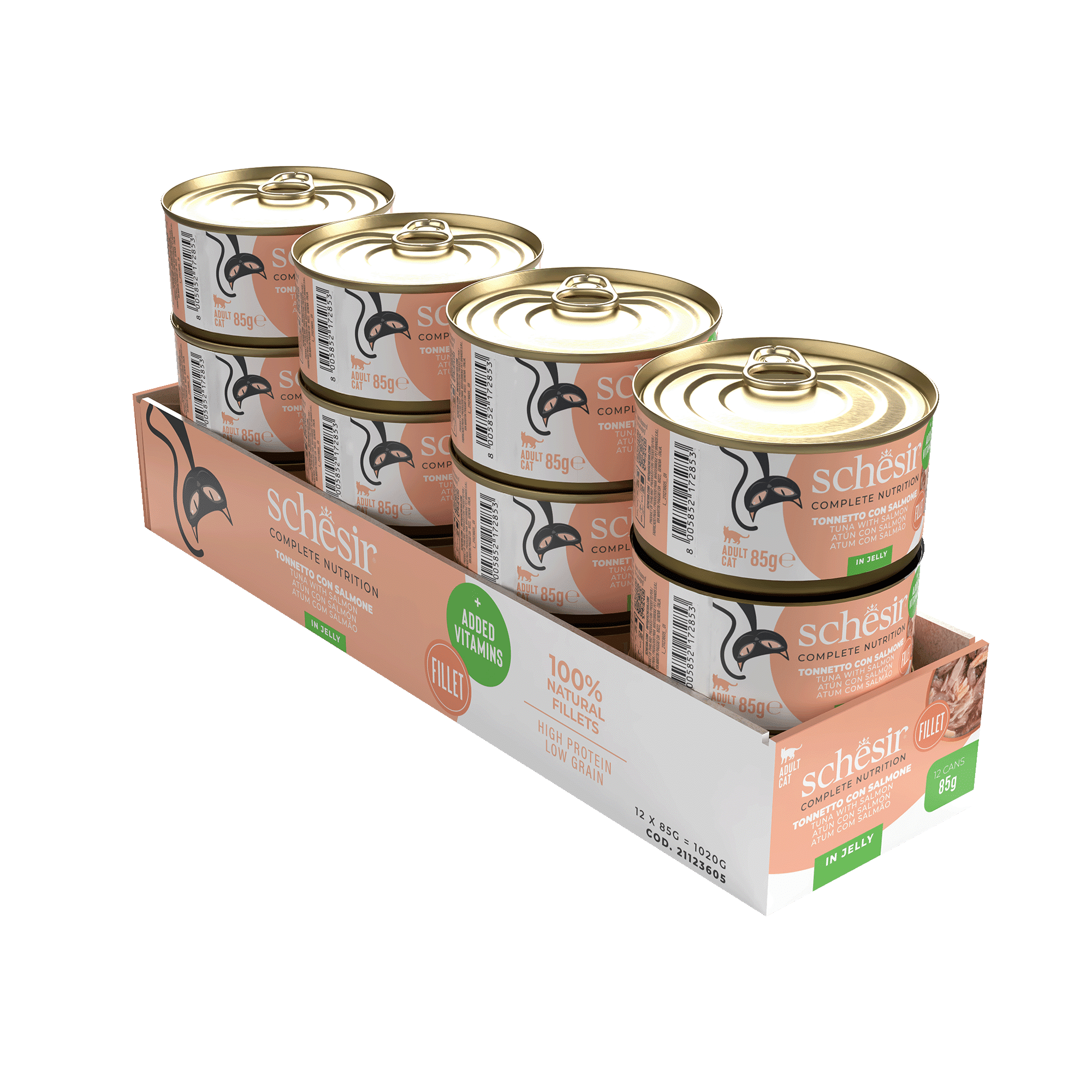 Suministrar hasta dos latas por día, acompañadas de piensos húmedos completos y/o croquetas Schesir. Servir a temperatura ambiente. Conservar en el frigorífico una vez abiertas y consumir en menos de 48 horas.