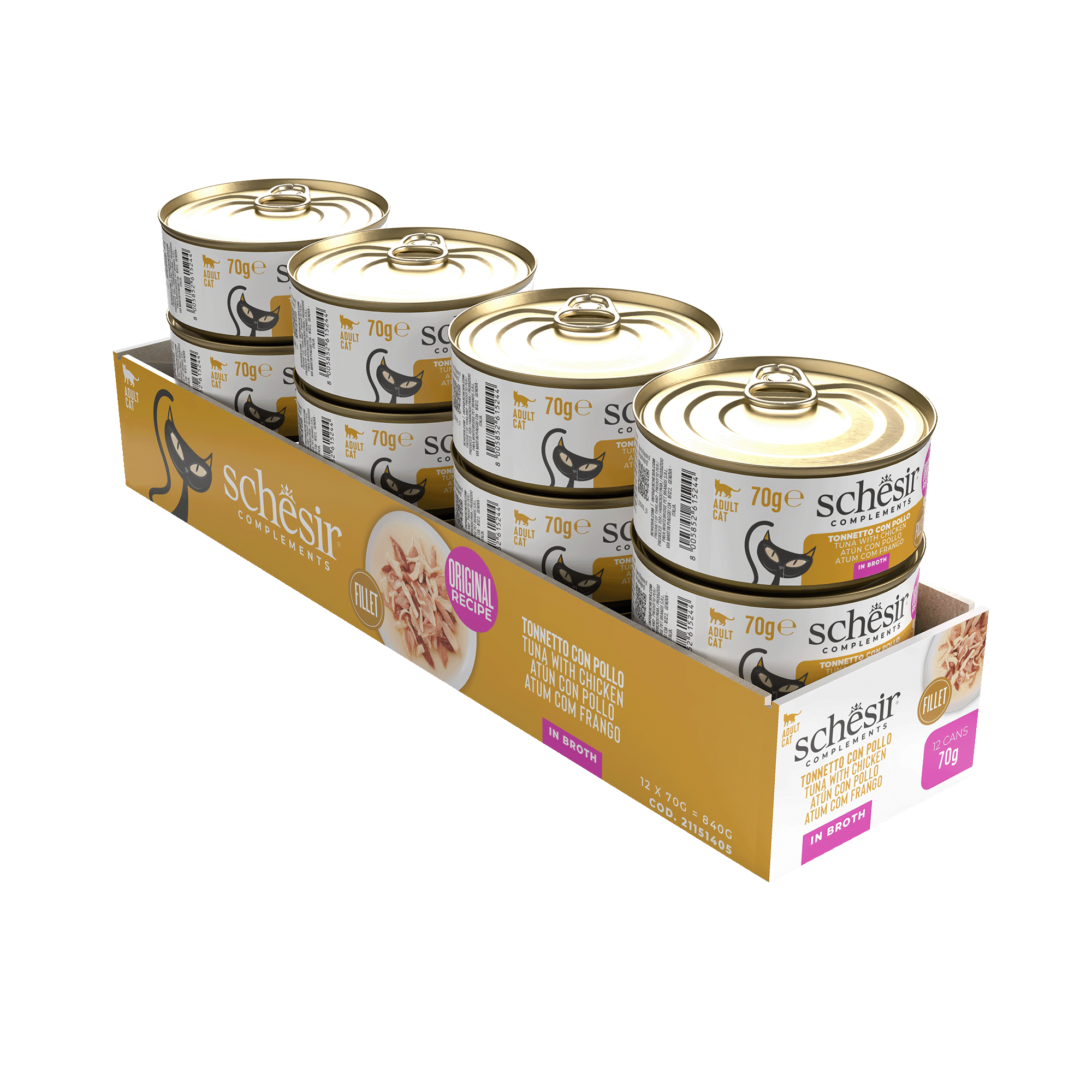 Suministrar hasta dos latas por día, acompañadas de piensos húmedos completos y/o croquetas Schesir. Servir a temperatura ambiente. Conservar en el frigorífico una vez abiertas y consumir en menos de 48 horas.