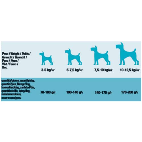 Componentes analíticos y Kcal/kg: proteína 26%, aceites y grasas brutos 16%, fibras brutas 2.8%, ceniza bruta 6.5%, calcio 1,1, Fósforo 0.8, Magnesio 0.2%, Sodio 0.43%, Potasio 0.65%, humedad 10%, Omega6 1.9%, Omega3 0.33%, 3.650 kcal/kg.