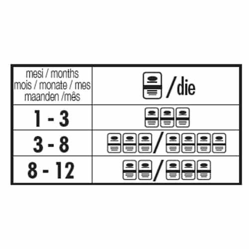 Ver tabla. La alternancia con croquetas Schesir es recomendable para obtener un nutrición completa. Servir a temperatura ambiente. Conservar en el frigorífico una vez abiertas y consumir en menos de 48 horas.