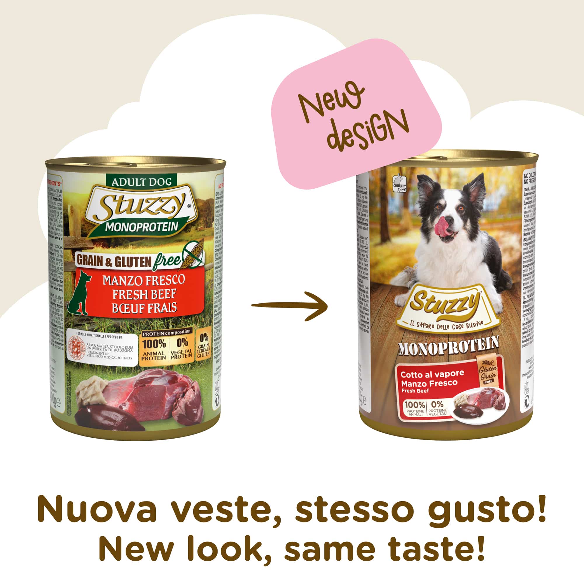 Composición: buey fresco 70%, caldo de buey 28,9%, sustancias minerales 1%, aceite de semillas de lino 0.1%.
