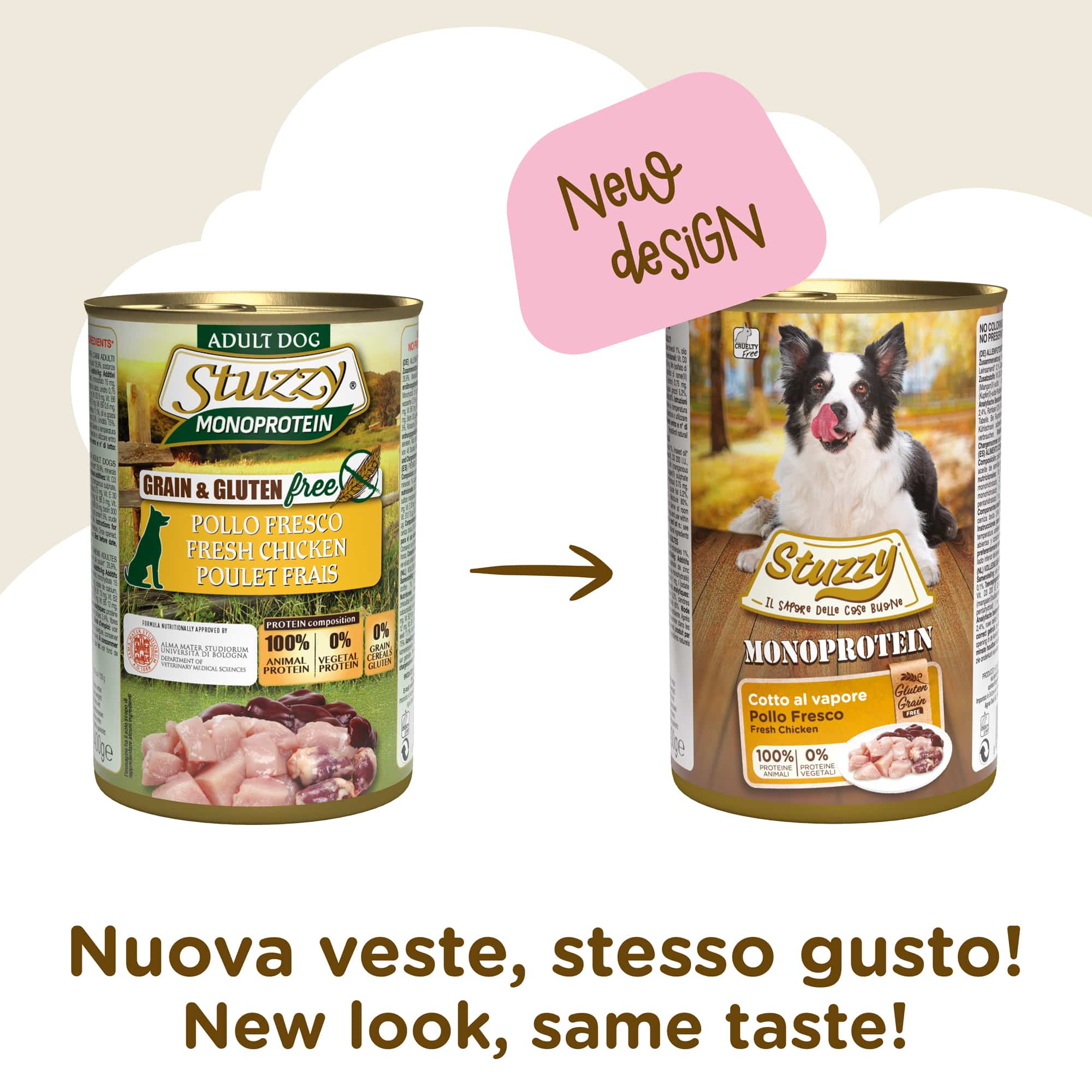 Composición: pollo fresco 70%, caldo de pollo 28,9%, sutancias minerales 1%, aceite de semillas de lino 0,1%.