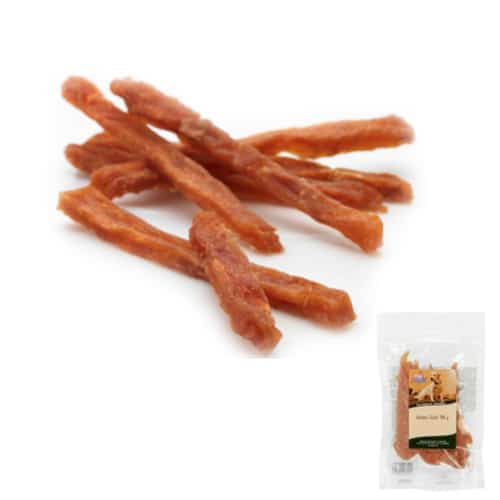 Snack natural de tiras de pollo desecadas para perro. Se presenta en un blister para su mejor conservación.